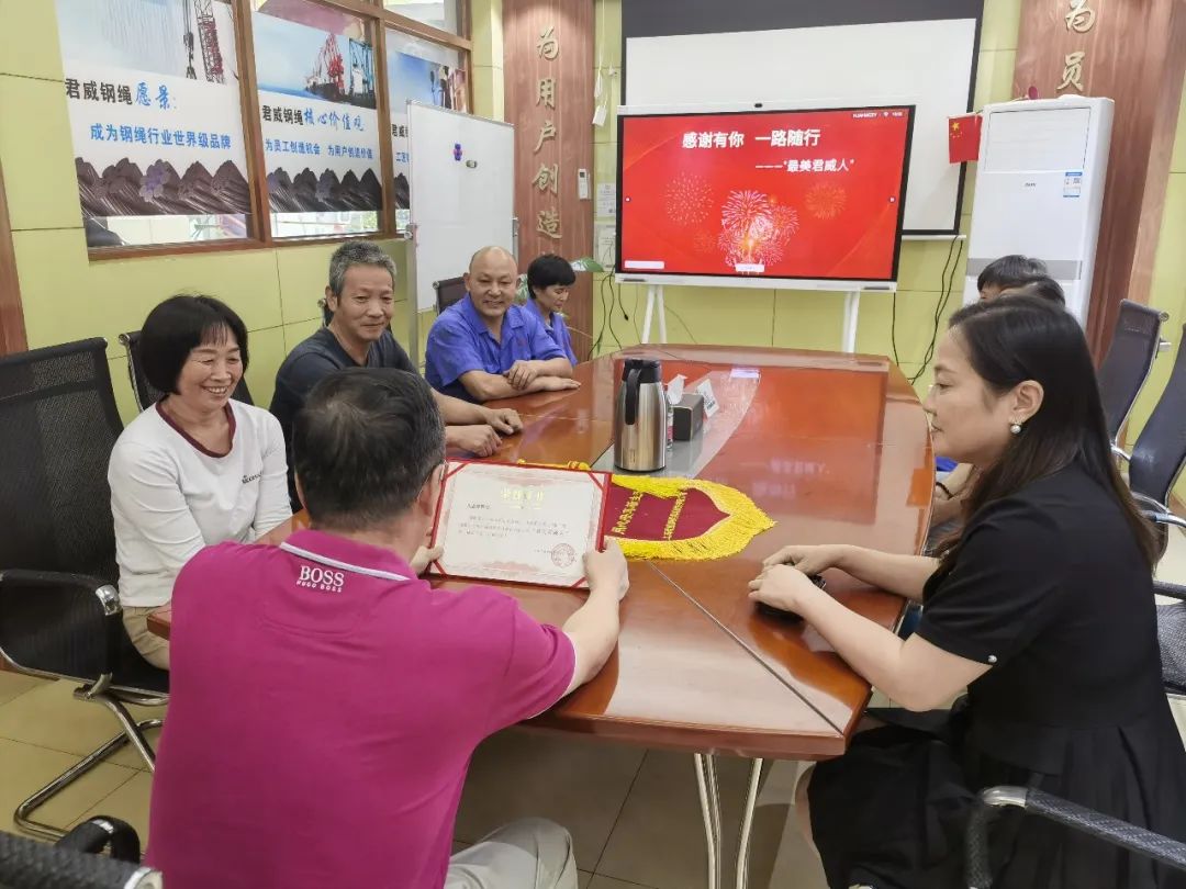盡管現(xiàn)在朱阿姨要光榮退休了,公司卻始終對其保持著一份敬意和關(guān)懷。董事長親自為朱志芳頒發(fā)了"最美君威人"榮譽證書,以及帶有充分感激和祝福的錦旗。頒發(fā)過程中,董事長說:"感謝多年來你對君威的貢獻,在崗位上一直任勞任怨,此次的離開希望你日后的生活中,好好調(diào)理身體,開心的過好每一天!"言語中充分對朱志芳的貢獻給予了肯定。